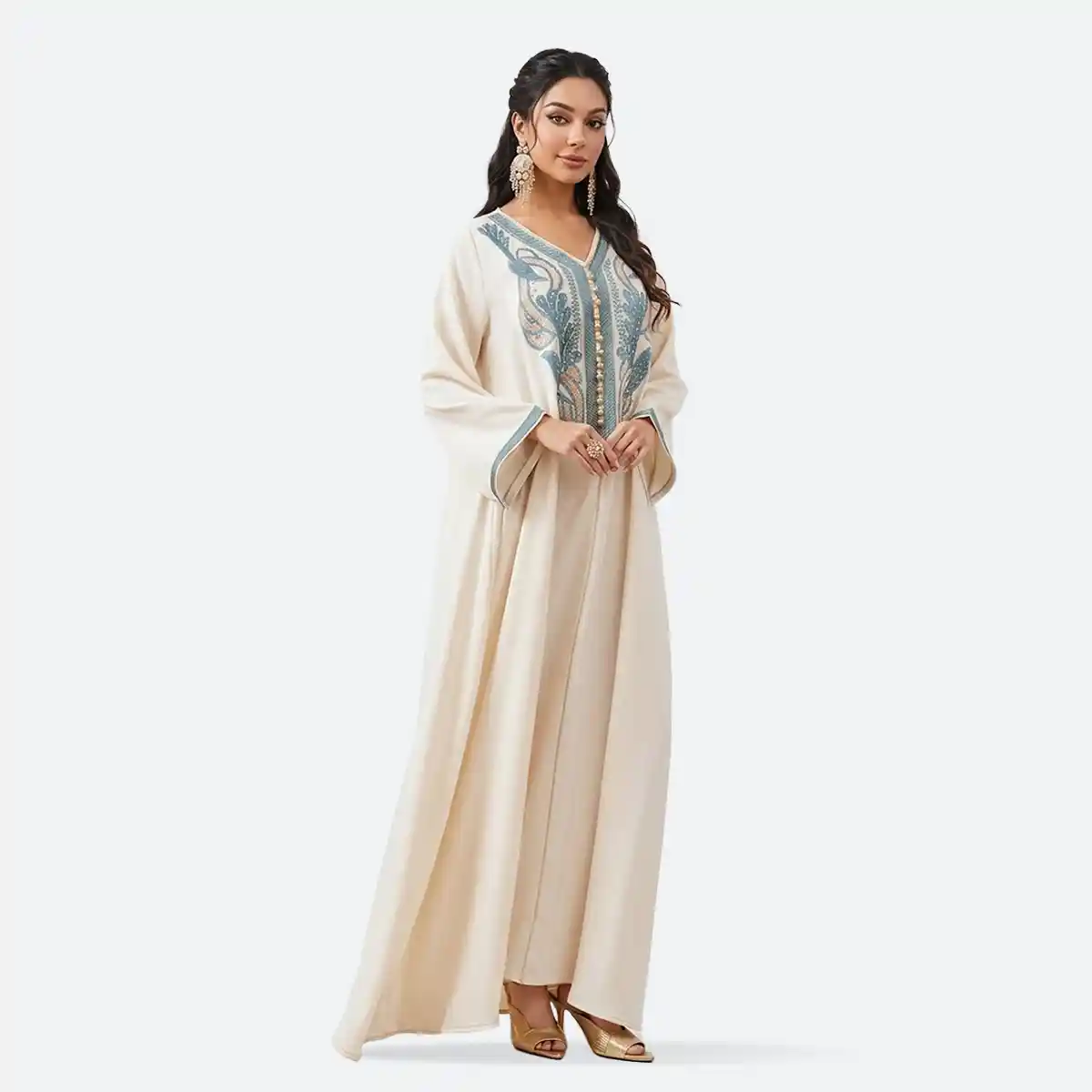 L’importance de la couleur dans cette abaya femme robe avec broderie ne doit pas être sous-estimée. La nuance crème, proche du beige clair ou de l’ivoire, est universellement flatteuse. Elle apporte une douceur immédiate et se marie avec toutes les carnations. Contrairement au blanc pur qui peut parfois paraître trop dur, le crème de notre abaya adoucit les traits et donne une apparence saine et lumineuse. Associée aux broderies diamant bleu pétrole, la couleur crée un contraste riche qui évoque le luxe des palais orientaux. Cette abaya femme robe avec broderie est un choix stratégique pour votre garde-robe : c’est une couleur qui ne se démode jamais et qui traverse les saisons avec une aisance déconcertante. En été, elle reflète la chaleur pour vous garder au frais, tandis qu’en hiver, elle apporte une clarté bienvenue au milieu des teintes sombres habituelles.