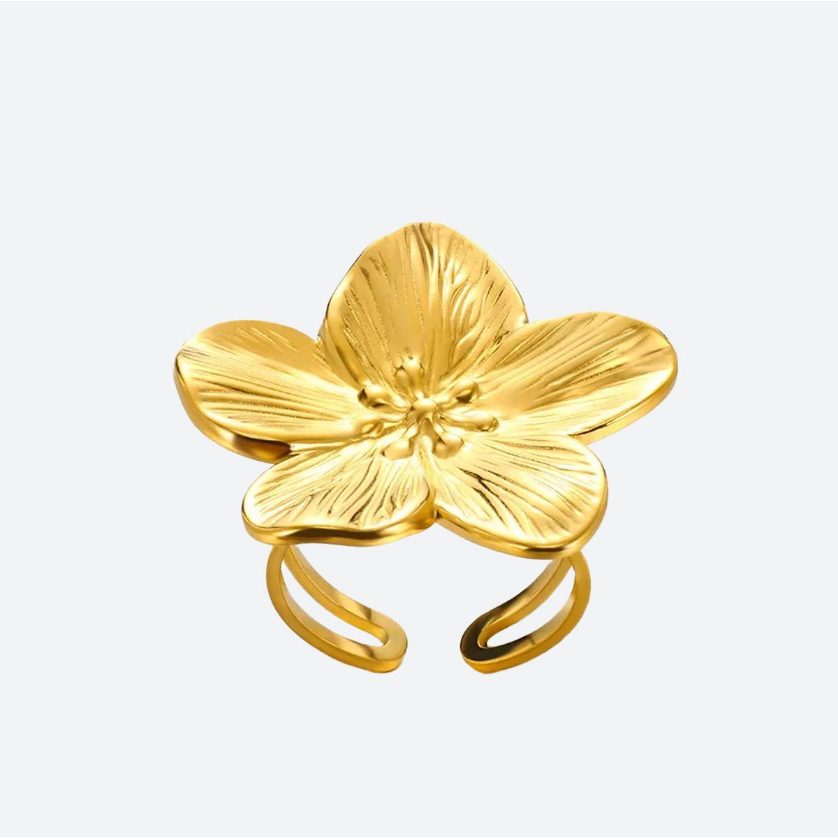 Célébrez la poésie de l’Orient avec cette bague, une pièce d’exception qui capture l’essence de l’éclosion printanière dans un métal noble et inaltérable. Ce bijou se distingue par son motif floral majestueux de 20 mm de diamètre, dont les cinq pétales sont finement striés pour créer un relief organique. Forgée en acier inoxydable de haute qualité avec une finition dorée par ionisation, cette bague est dotée d’un anneau double ajustable, garantissant un confort sur mesure et une élégance qui résiste à l’eau comme au temps.