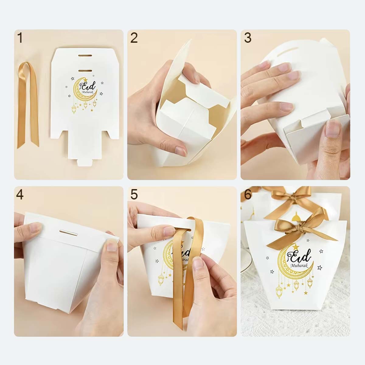 Dans l’univers de la décoration de fête, l’association du blanc et de l’or est une signature indémodable du luxe et de la pureté, et notre boîte cadeau Eïd exploite ce contraste pour créer un impact visuel maximal sous les lumières de votre foyer. Le blanc satiné du carton reflète la clarté et la propreté, tandis que le marquage doré à chaud capte la moindre étincelle, faisant scintiller les étoiles et les lanternes comme si elles étaient réellement allumées. Ce choix chromatique permet à la boîte de s’intégrer dans tous les styles d’intérieurs, du plus moderne au plus traditionnel, s’accordant parfaitement avec vos plus belles vaisselles et vos compositions florales. Le ruban doré, au-delà de sa fonction de fermeture, apporte une verticalité élégante à l’objet, créant un rappel de couleur avec les motifs imprimés et offrant une finition digne des plus grandes boutiques de luxe. En disposant vos lots de 5 ou 10 boîtes cadeaux Eïd sur un plateau en miroir ou une nappe damassée, vous créez une ambiance royale qui valorise non seulement vos présents, mais aussi tout l’effort de réception que vous avez fourni pour honorer vos invités. C’est cette attention portée au détail visuel qui transforme une simple remise de cadeau en un moment de grâce et de reconnaissance mutuelle.