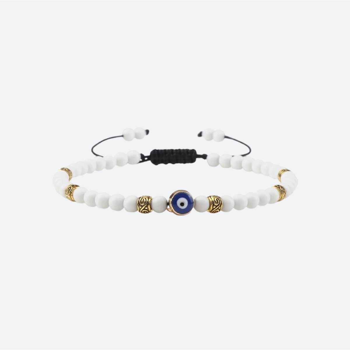 Le modèle de bracelet islam oeil en perles blanches mates incarne la pureté et la clarté d’esprit. Le blanc, symbole de paix et d’innocence, offre un fond neutre et élégant qui fait ressortir les détails dorés des séparateurs et l’intensité de l’oeil protecteur. Ce bracelet est souvent choisi pour accompagner des moments de recueillement ou pour célébrer un nouveau départ. Sa sobriété en fait un accessoire polyvalent qui peut se porter seul pour un look minimaliste ou en accumulation avec d’autres bracelets Arjazia pour un style plus affirmé. C’est le symbole de la foi tranquille et de la protection sereine.